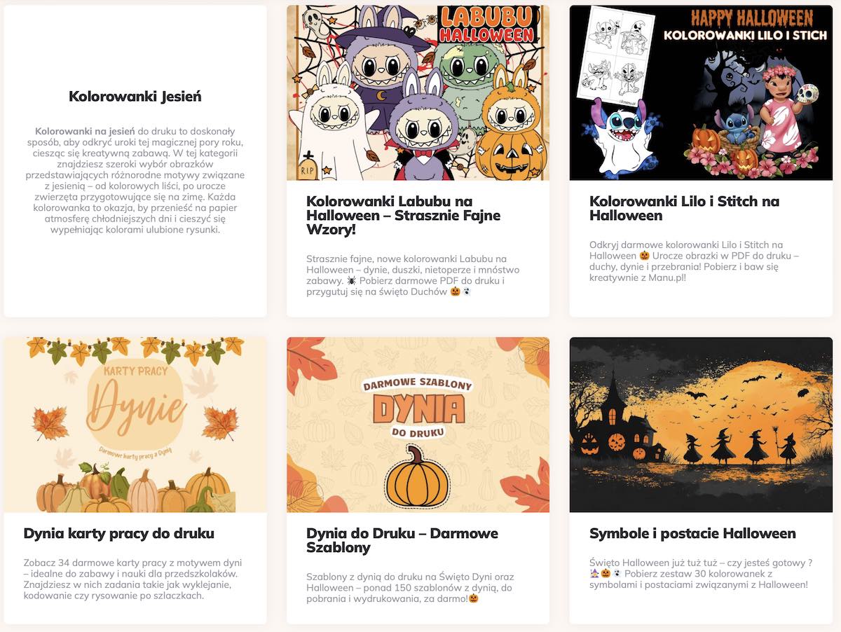 To w pełni darmowe materiały w formacie PDF do druku, które można pobrać w kilka chwil i wykorzystać zarówno w domu, jak i w każdej placówce edukacyjnej. Na stronie manu.pl dostępne są także szablony dyni do wycinania oraz karty pracy z dynią, które świetnie uzupełnią halloweenowe zabawy i zajęcia w szkole czy przedszkolu.