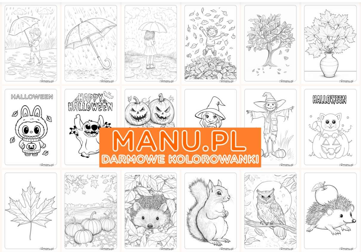 darmowe kolorowanki jesienne do wydrukowania ze strony manu.pl – wzory z padającym deszczem, parasolami, opadającymi liśćmi – zwierzętami na jesień – wiewiórki z orzechami, sowy, jeże i jabłka, szablony liści klonu, dynie oraz kolorowanki na halloween dla dzieci z Labubu, z bohaterami Lilo i Stitch, strachy na wróble, ozdobne dynie z wydrążonymi oczami